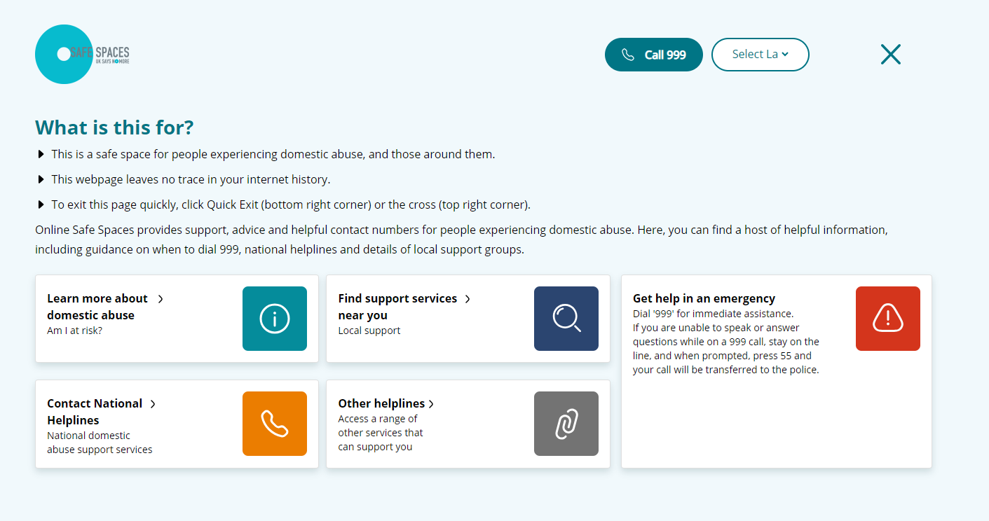 This is a free widget you can add on to your website, enabling those experiencing domestic abuse to discreetly access support by clicking on the Safe Spaces logo on your homepage footer.